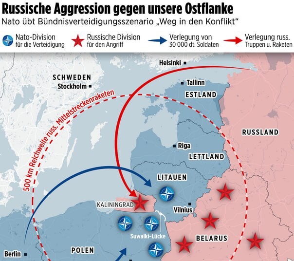 In dem Dokument heißt es, dass die russische Armee bis Juni 2024 die ukrainischen Streitkräfte besiegen kann und es dann angeblich zu einer Eskalation in den baltischen Staaten kommen wird. Dem „Szenario“ zufolge wird die NATO bis 2025 300.000 Soldaten, darunter 30.000 Bundeswehrsoldaten, an die Ostflanke verlegen, um die Russische Föderation „einzudämmen“.