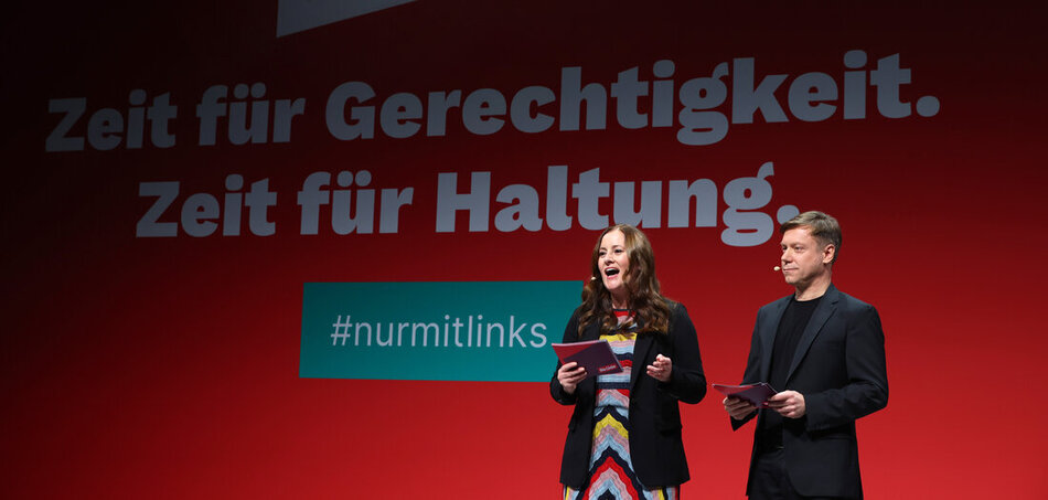 Die beiden Parteivorsitzenden Janine Wissler und Martin Schirdewan begrüßten die Delegierten gemeinsam. »Wir sind die Roten, wir bleiben die Roten«, rief Wissler in die Augsburger Messehalle. »Wir sind die sozialistische Gerechtigkeitspartei«, betonte Schirdewan. Er fügte hinzu: »Wir müssen uns nicht verstecken«, aber »besser werden«. Der Applaus für die beiden Vorsitzenden war merklich verhaltener als im vergangenen Jahr in Erfurt, als die damals vorübergehend allein amtierende Parteichefin Wissler noch mit demonstrativem Jubel empfangen worden war.