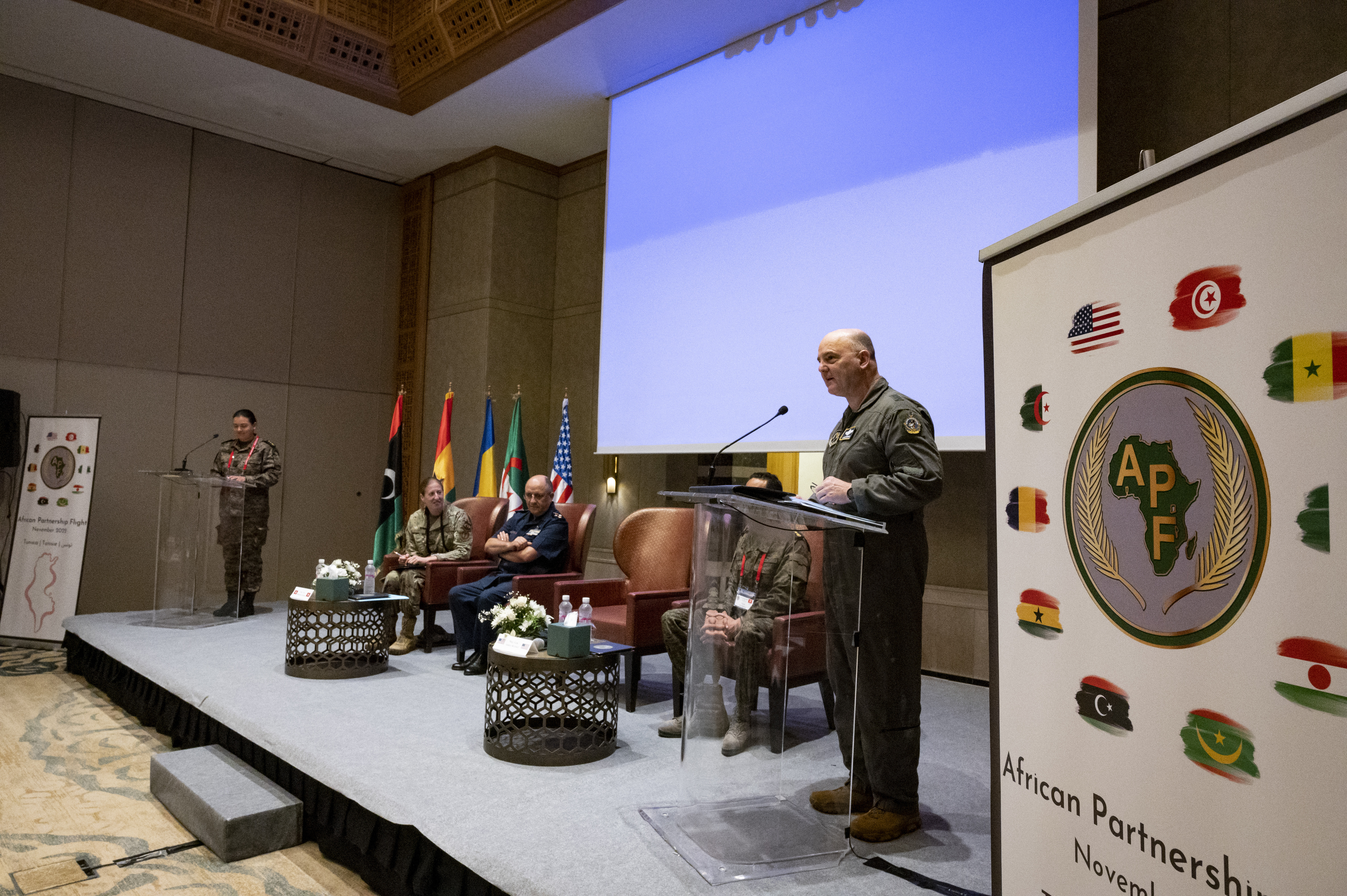 U.S. Air Force Maj. Gen James Kriesel, U.S. Air Forces in Europe and Air Forces Africa national guard assistant to the commander, [gave] opening remarks during the 2022 African Partnership Flight held in Tunis, Tunisia, Nov. 2, 2022. The APF hosted partners from across North and West Africa, including delegations from Algeria, Chad, Ghana, Libya, Mauritania, Niger, Nigeria, and Senegal as well as the two co-hosts, Tunisia and the U.S. The event will focus on broadening interoperability on Intelligence, Surveillance, and Reconnaissance objectives.
