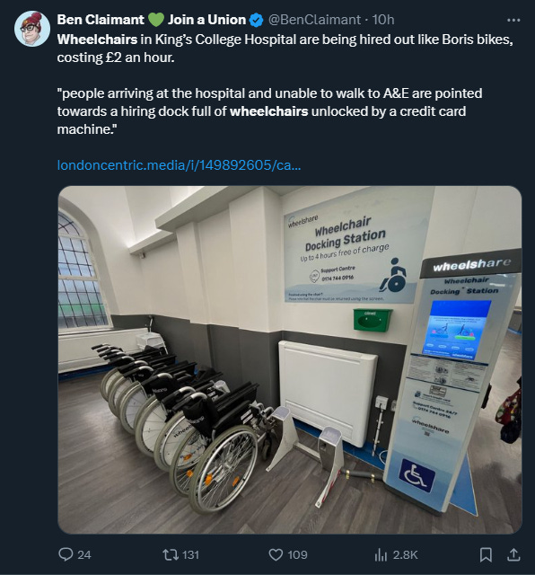 The latest horror story to emerge is that King’s College Hospital in London has decided it would be a brilliant idea to charge people for the use of wheelchairs. The story was originally broken by