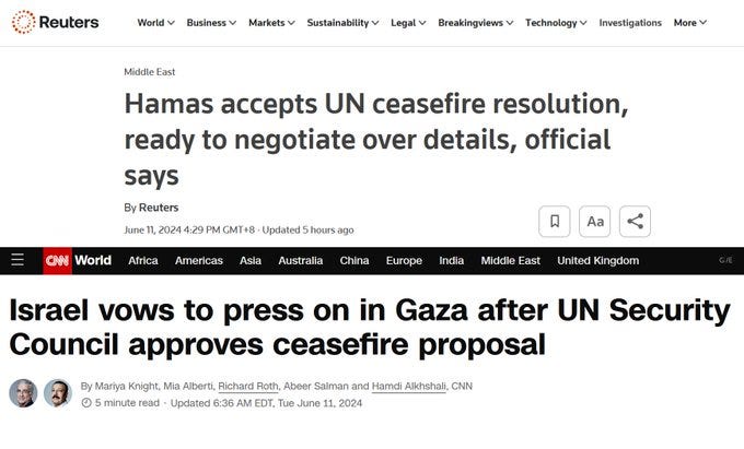 When a UN resolution called for the US ceasefire proposal to be implemented about three days ago, the resolution stated that Israel had already agreed to the proposal and Hamas must now do so, but this was not entirely accurate.