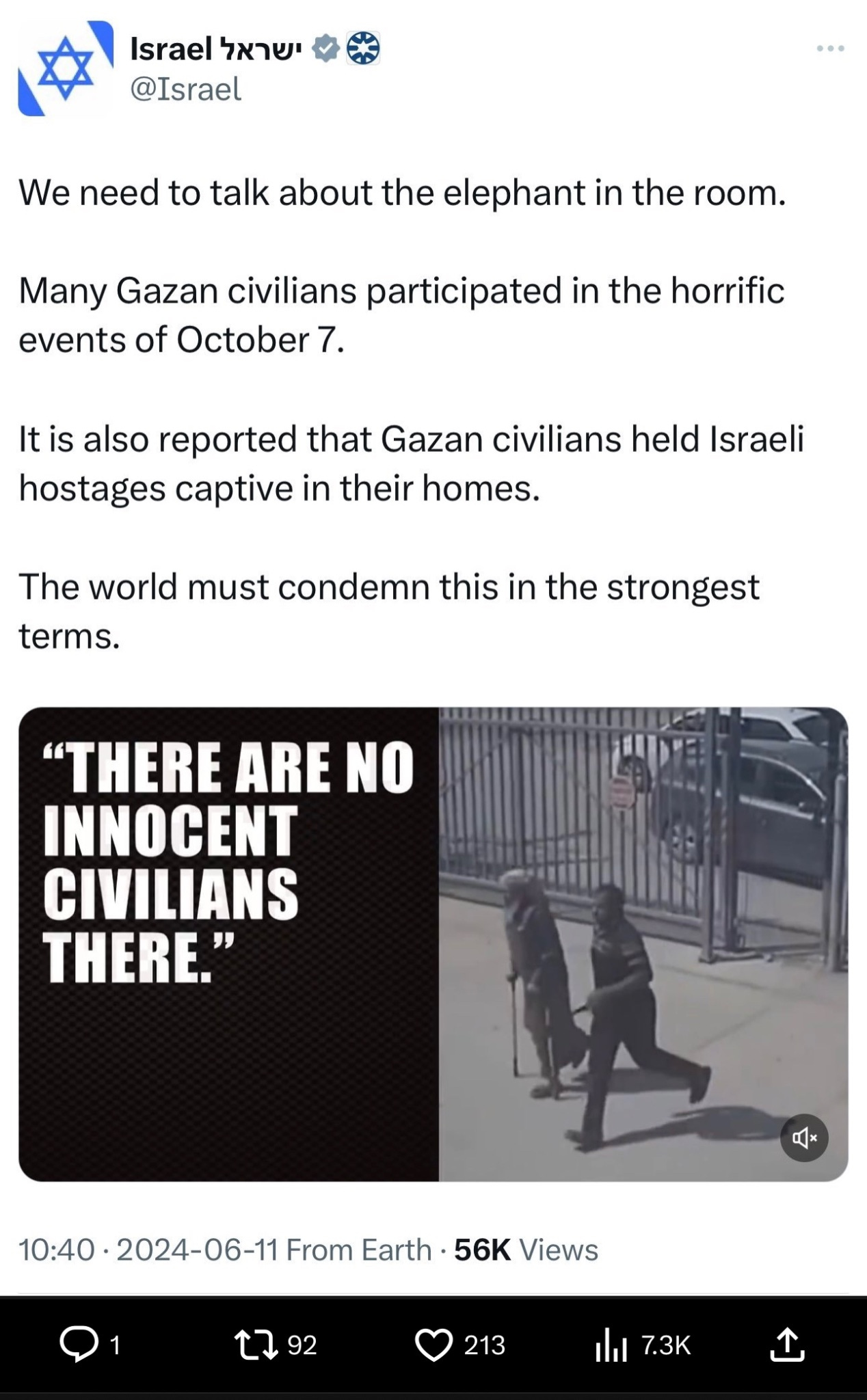 Israel ran a paid ad on Twitter saying there are no innocents in Gaza, meaning they don’t consider children to be innocent. This is a view Israeli officials have expressed repeatedly on television. The concept of collective guilt is obviously genocidal and was used against Jews during the holocaust. Israel was prepared to pay for the concept of collective Gazan guilt to be displayed on as many screens as possible, but it would jail Al Jazeera journalists for showing footage of the IDF’s summary executions.