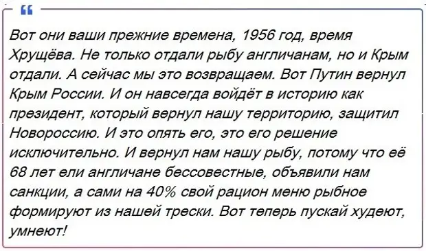 Well, the Head of the State Duma, Vyacheslav Volodin, put the finishing touches on the 1956 Soviet-British agreement on fishing in the Barents Sea.